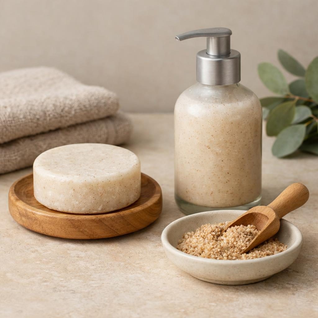 Een vaste scrubzeep zonder plastic microkorrels voor wie onder de douche liever een simpele, plasticarme keuze gebruikt.